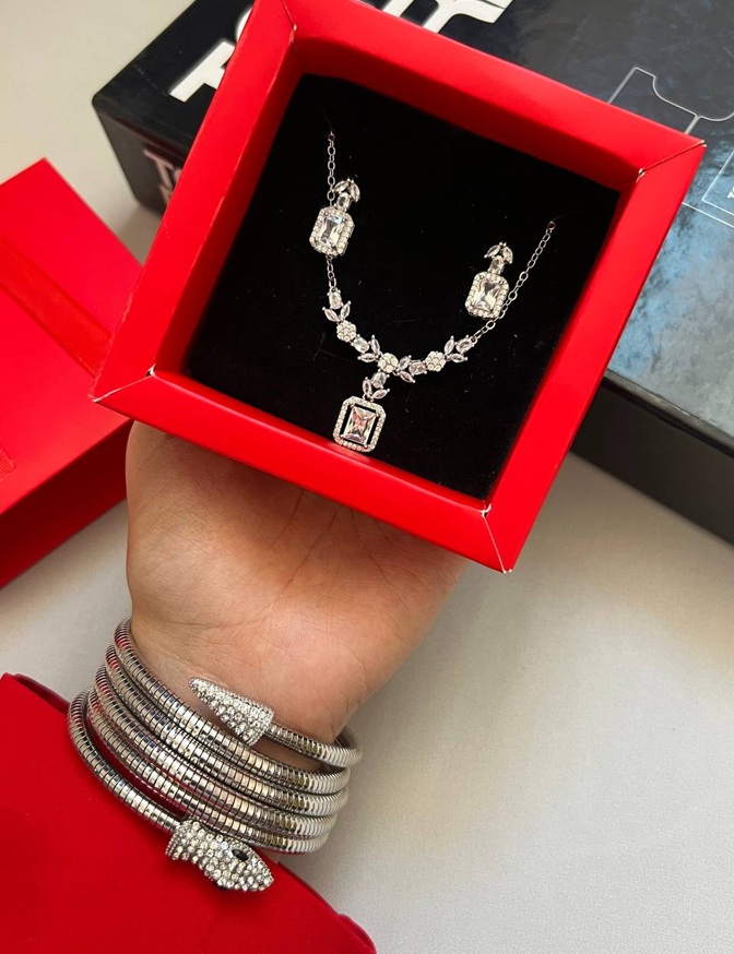 این محصول وارداتی از کشور ترکیه بوده و تمامی جزئیات دقیقا مشابه نمونه طلای آن و دارای نمای چند بعدی میباشد. اقلام سرویس شامل گوشواره و گردنبند آب نقره-رنگ ثابت ضدحساسیت نگین ها ریزش ندارن